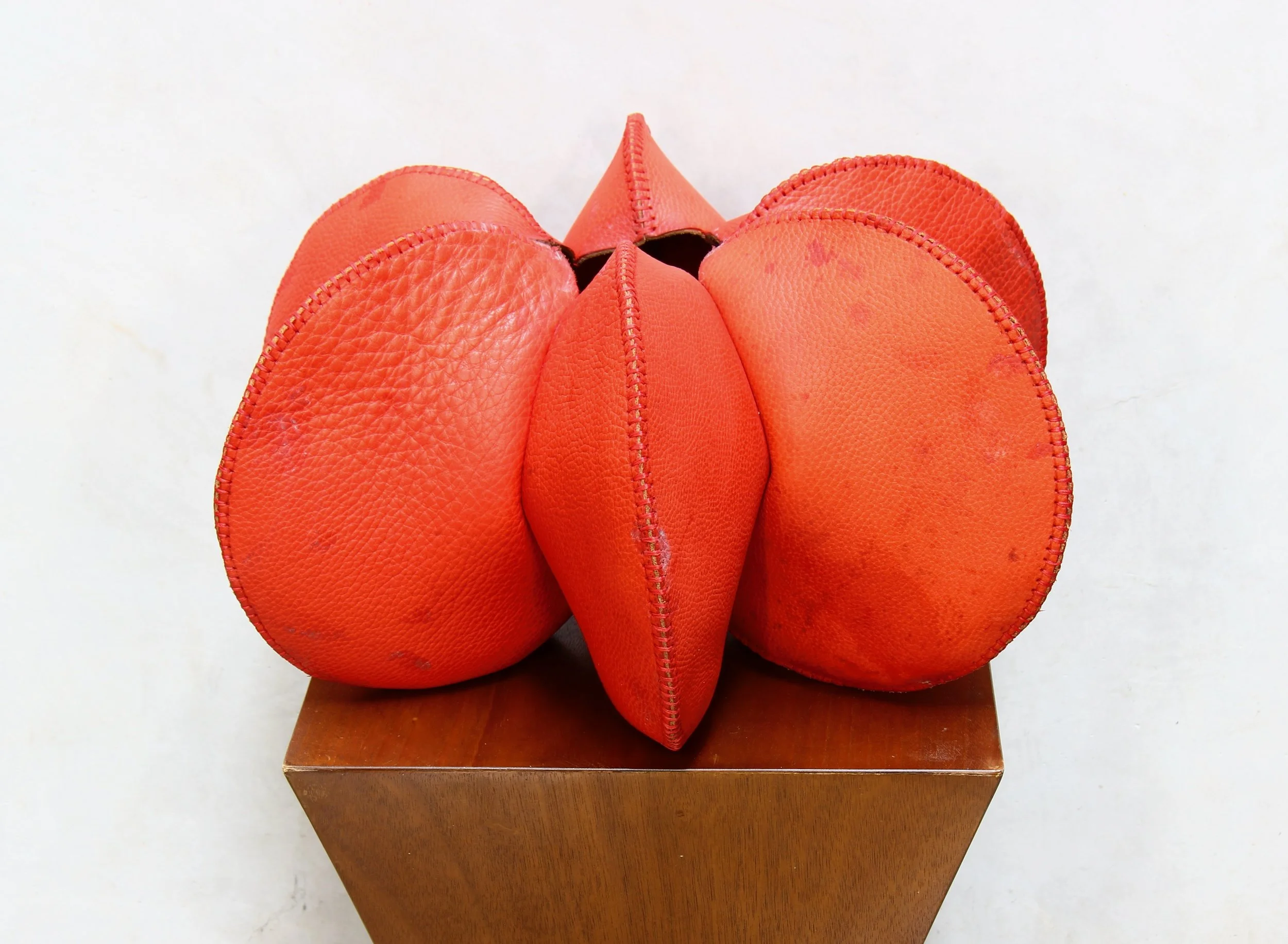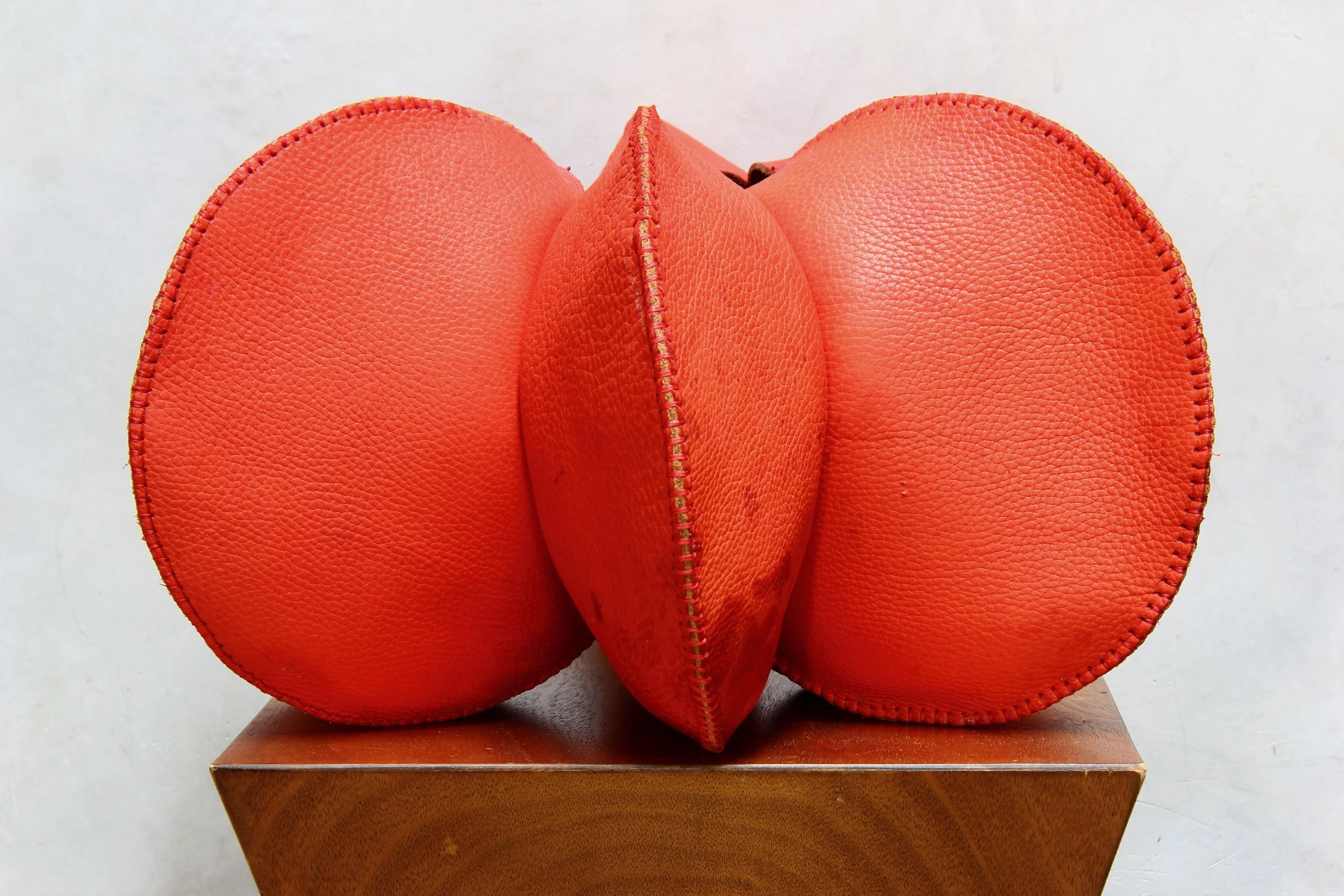 Materials: hand stitched leather, glass, cement weight